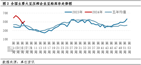 无论是从上游企业大豆库存水平还是大豆预估进口量来看,供应端都未见缺口。据卓创资讯数据显示,截至2月16日,全国重点大豆压榨企业豆粕库存为516.50万吨,较2月2日增加53.40万吨,高于去年同期及五年均值水平。同时卓创资讯根据船期给出2月460万吨、3月650万吨的大豆进口量预估,此外,中国也有较多的国储大豆。综合来看,原料端仍然呈现偏宽松的状态,部分上游大豆压榨企业也出于担忧后续大豆供应压力的考量,出货意愿较高。随着上游企业开机水平的陆续恢复,供应端或继续向豆粕现货价格释放压力。